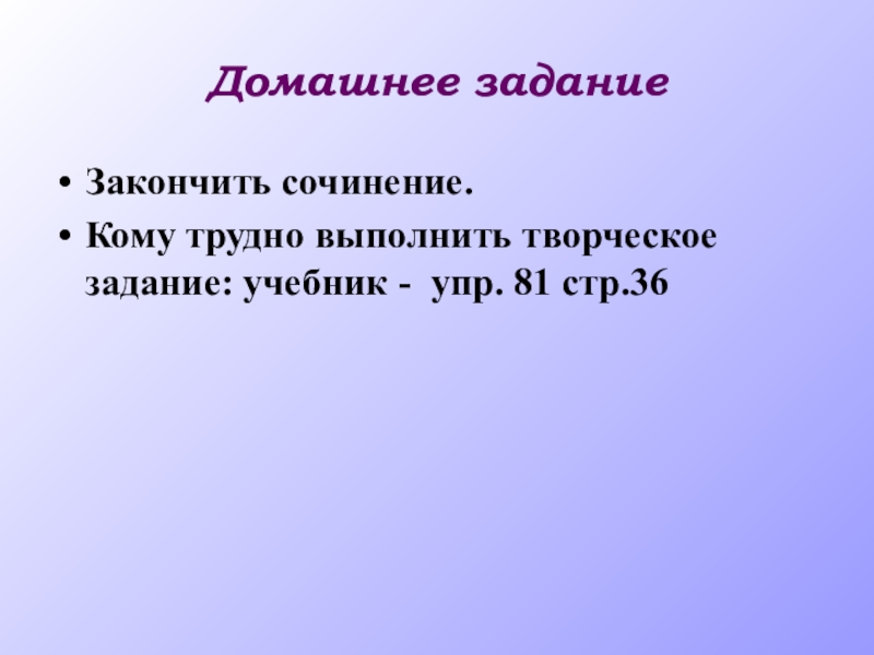 Домашнее заданиеЗакончить сочинение.Кому трудно выполнить творческое задание: учебник - упр. 81 стр.36