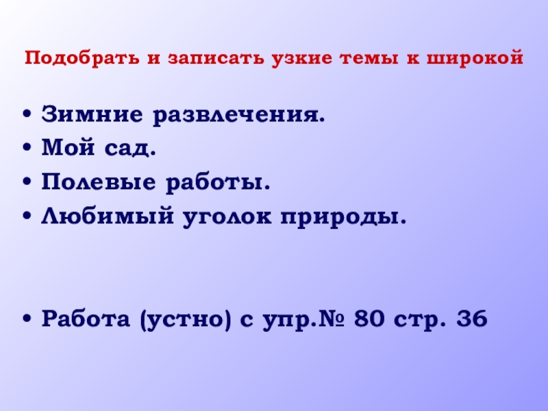 Подобрать и записать узкие темы к широкойЗимние развлечения.Мой сад.Полевые работы.Любимый уголок природы.Работа (устно) с упр.№ 80 стр.