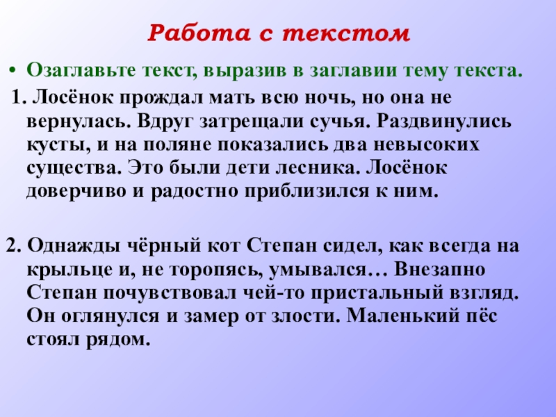 Работа с текстомОзаглавьте текст, выразив в заглавии тему текста. 1. Лосёнок прождал мать всю ночь, но она
