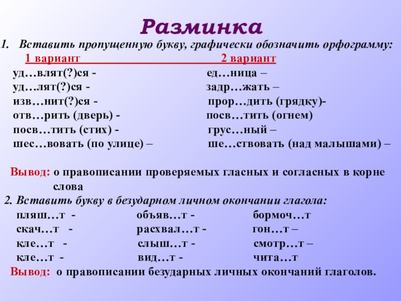 РазминкаВставить пропущенную букву, графически обозначить орфограмму: 1 вариант 2 вариант