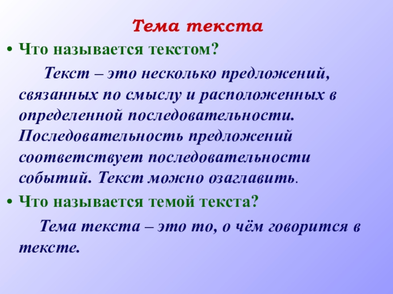 Тема текстаЧто называется текстом?     Текст – это несколько предложений, связанных по смыслу и
