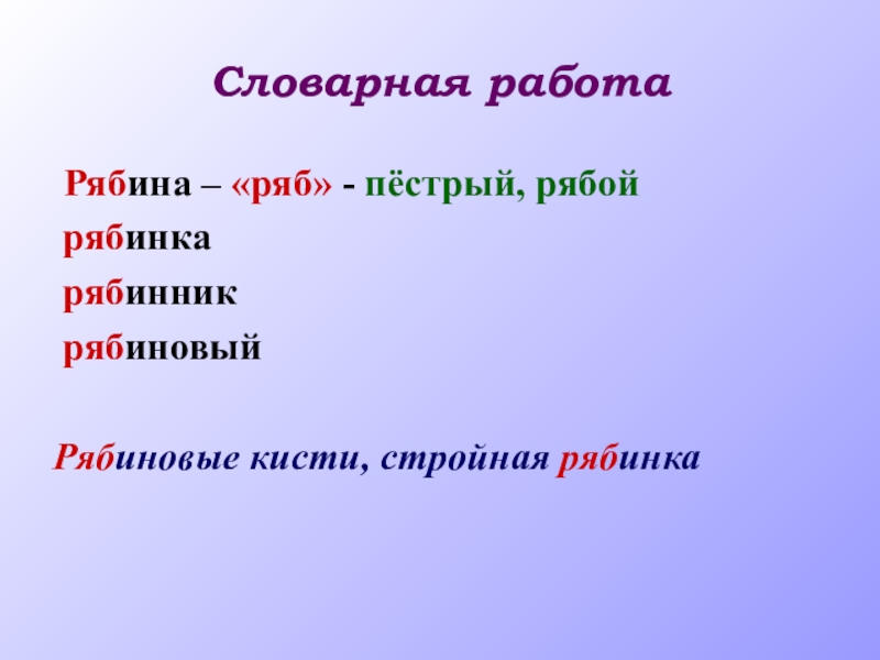 Словарная работа Рябина – «ряб» - пёстрый, рябой рябинка рябинник рябиновыйРябиновые кисти, стройная рябинка