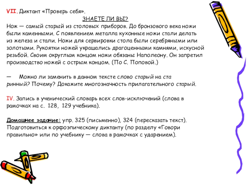 IV. Запись в ученический словарь всех слов-исключений (слова в рамочках на с. 128, 129 учебника).
