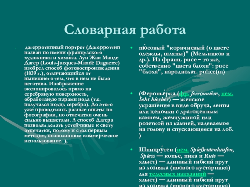 дагерротипный портрет (Дагерроттип назван по имени французского художника и химика. Луи Жак Манде Дагер (Louis-Jacques-Mandé Daguerre) изобрел способ фотовоспроизведения (1839 г.), отличающийся от нынешнего тем, что в нем не было негатива. Изображение экспонировалось прямо на серебряную поверхность, обработаную парами иода (т.е. получался иодид серебра). До этого уже проводились разные опыты по фотографии, но отпечатки очень сильно выцветали. А способ Дагера позволял делать устойчивые к свету отпечатки, потому и стал первым методом, позволившим коммерческое использование. ),