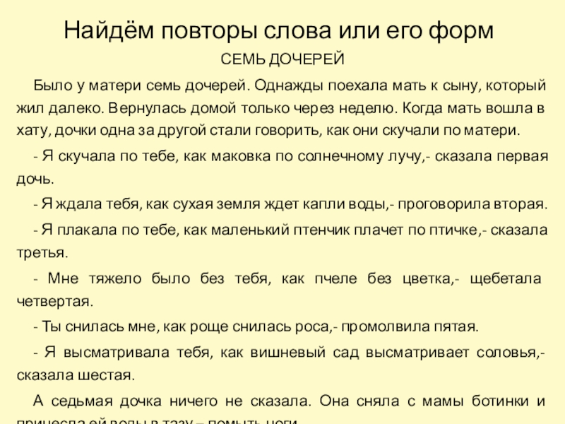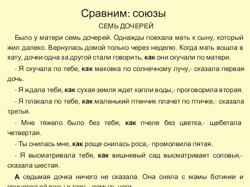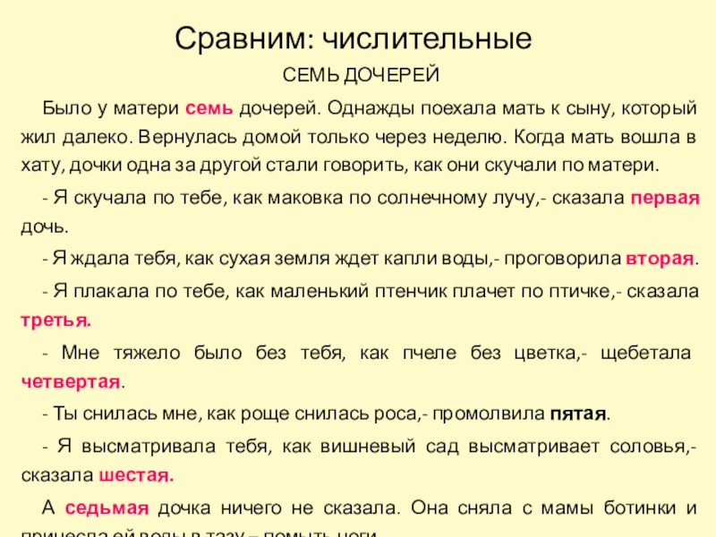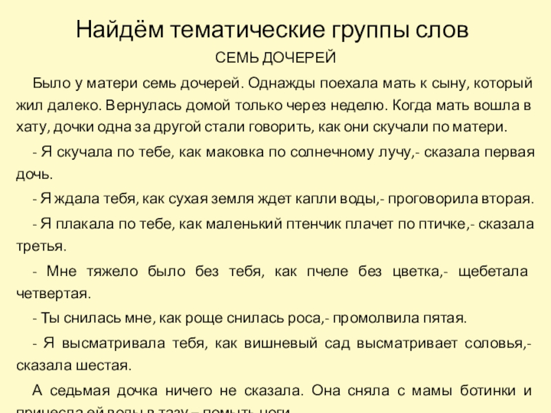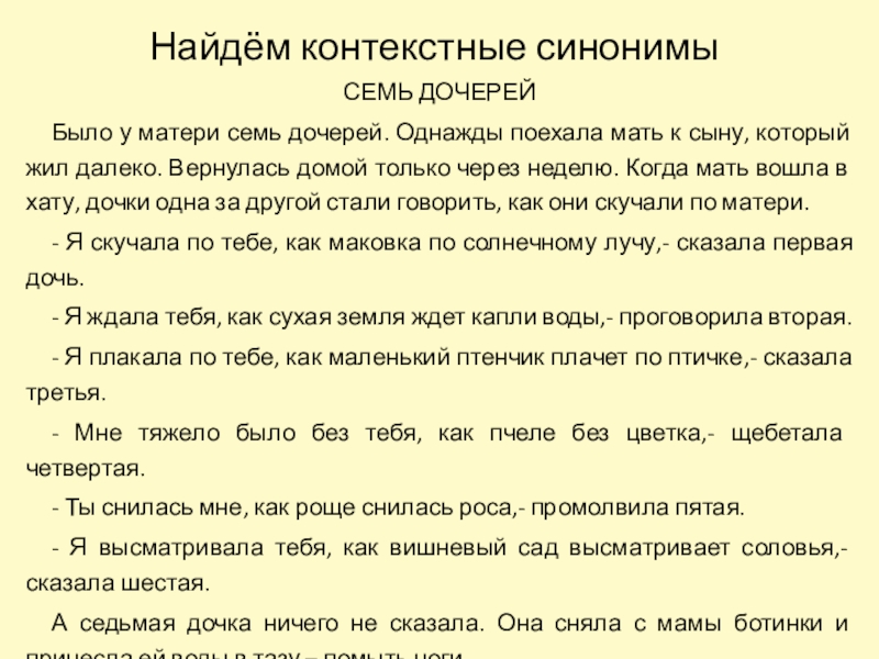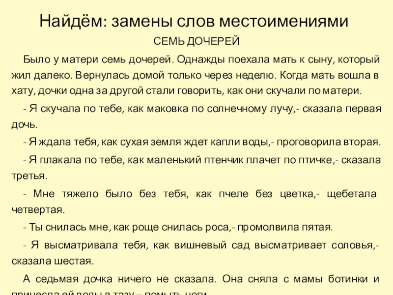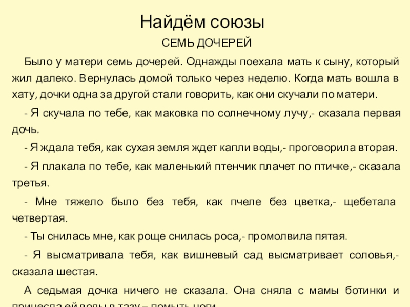 А седьмая дочка ничего не сказала. Она сняла с мамы ботинки и принесла ей воды в тазу – помыть ноги. (В. Сухомлинский).