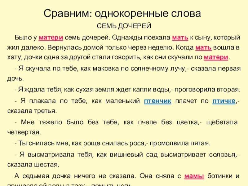 мать к сыну, который жил далеко. Вернулась домой только через неделю. Когда мать вошла в хату, дочки одна за другой стали говорить, как они скучали по матери.