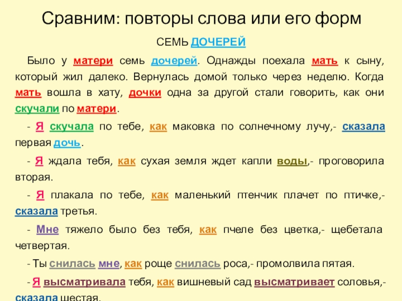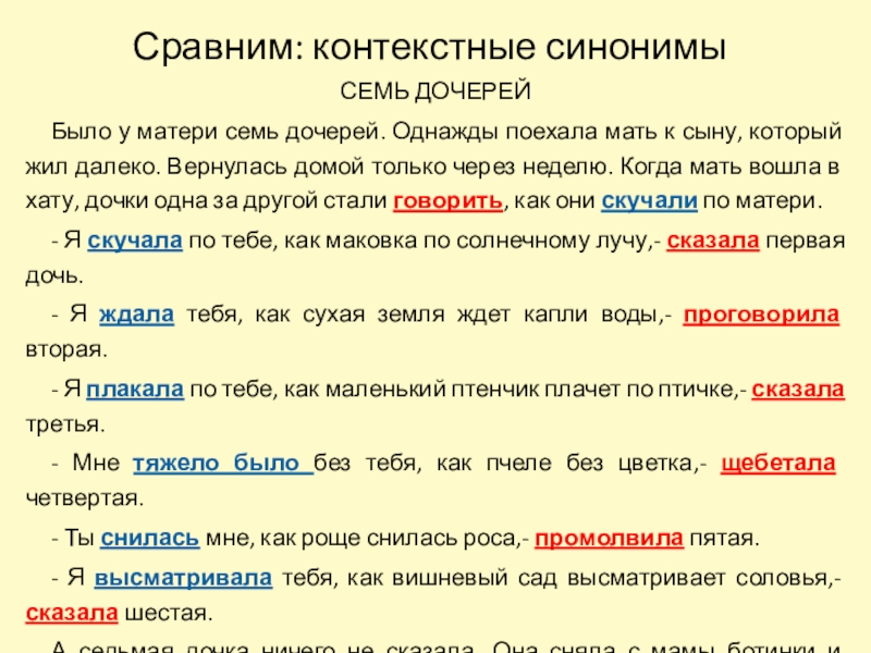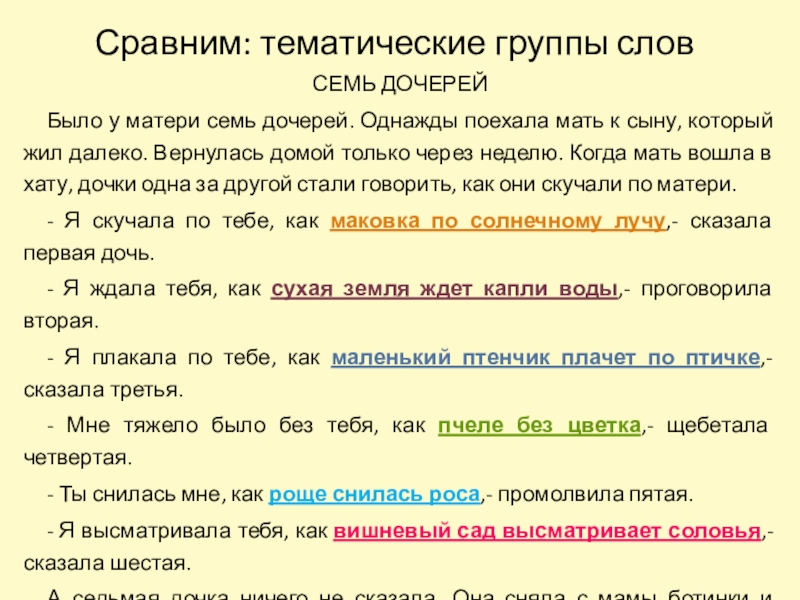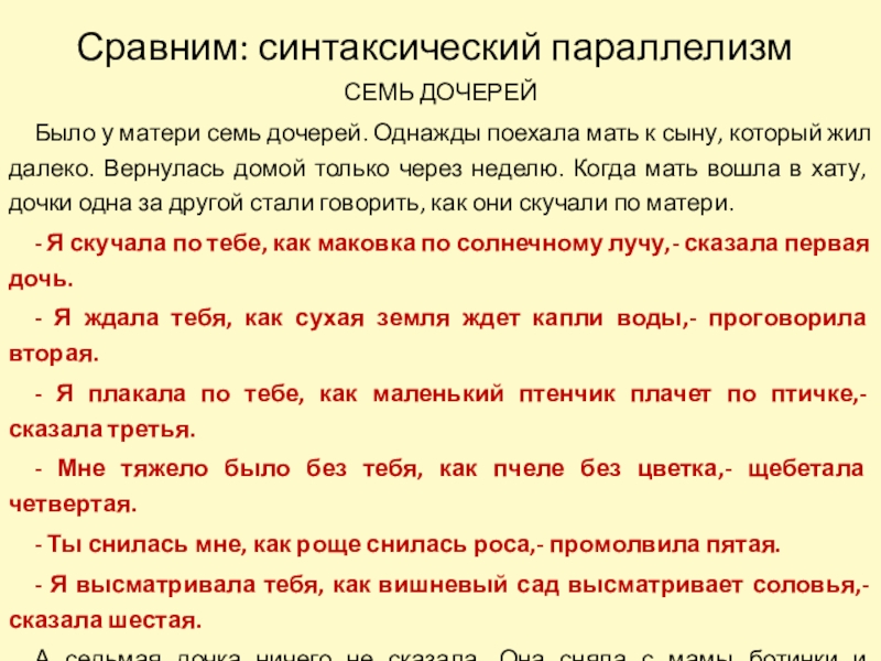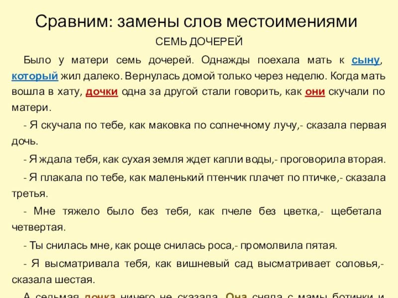 - Я скучала по тебе, как маковка по солнечному лучу,- сказала первая дочь.