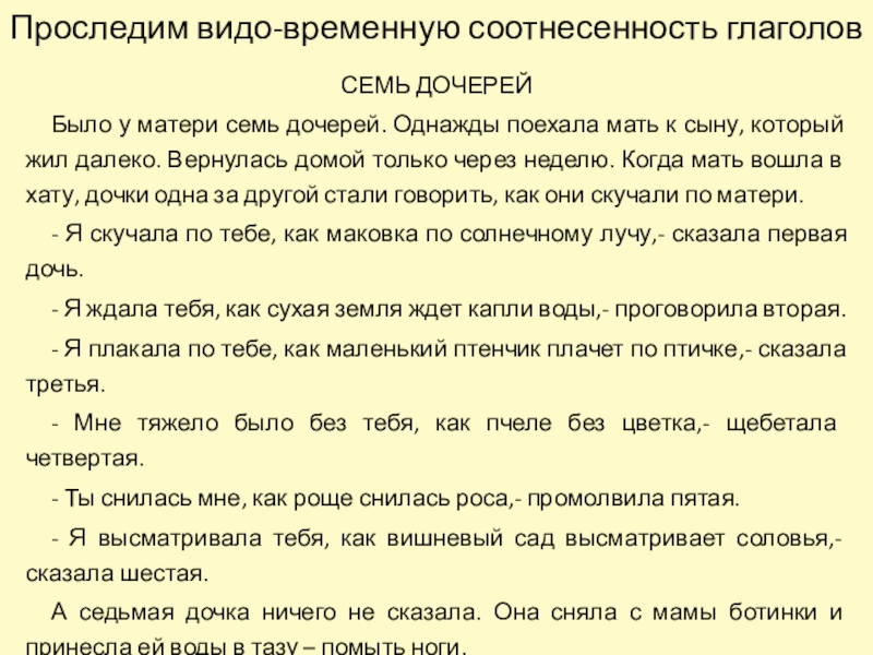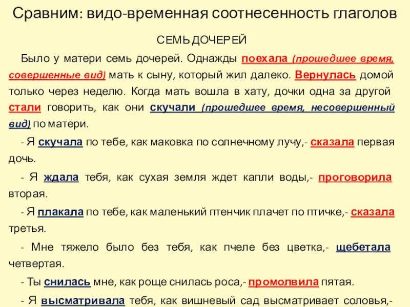 (прошедшее время, совершенные вид) мать к сыну, который жил далеко. Вернулась домой только через неделю. Когда мать вошла в хату, дочки одна за другой стали говорить, как они скучали (прошедшее время, несовершенный вид) по матери.