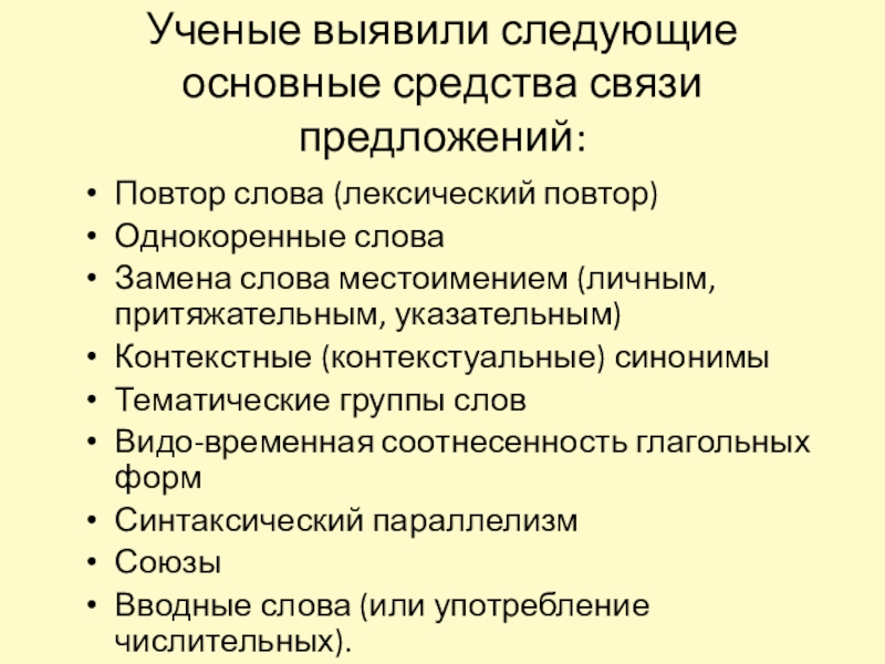 Слайд 2Ученые выявили следующие основные средства связи предложений: