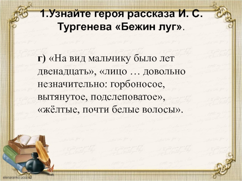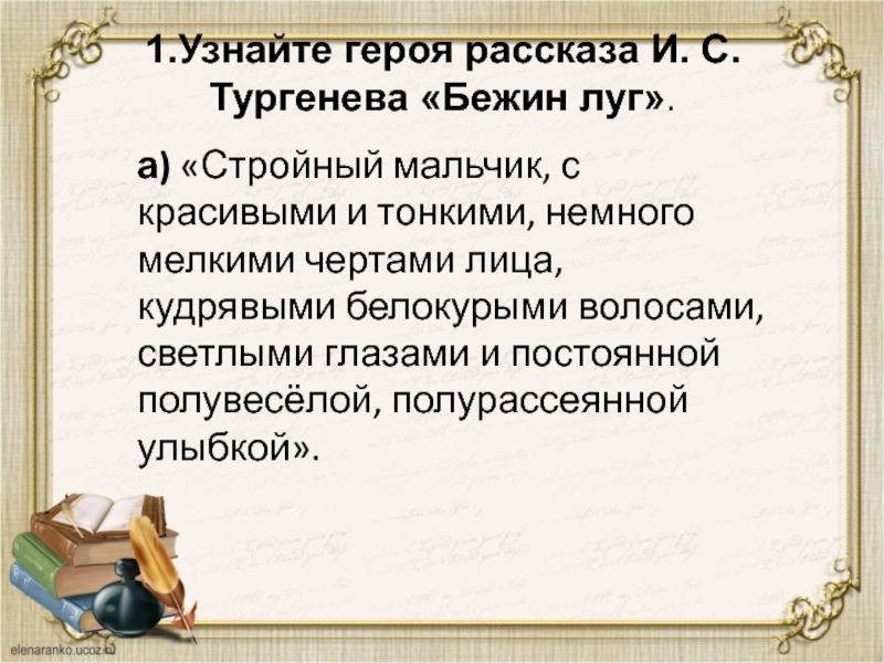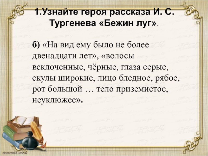 Слайд 91.Узнайте героя рассказа И. С. Тургенева «Бежин луг».