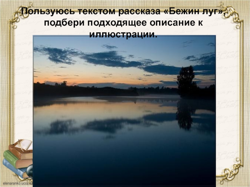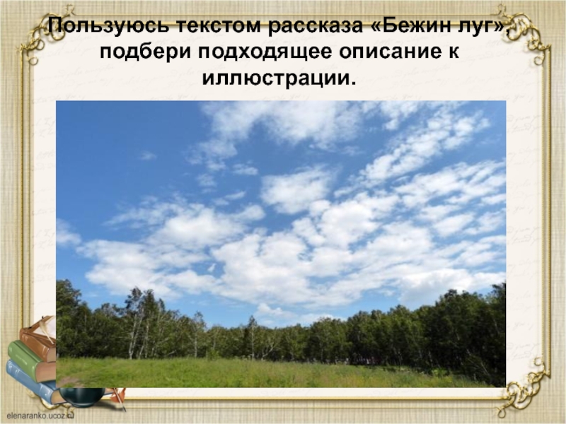 Слайд 12Пользуюсь текстом рассказа «Бежин луг», подбери подходящее описание к иллюстрации.