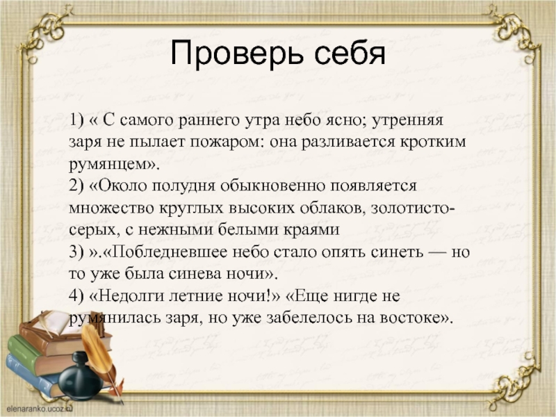 4) «Недолги летние ночи!» «Еще нигде не румянилась заря, но уже забелелось на востоке».