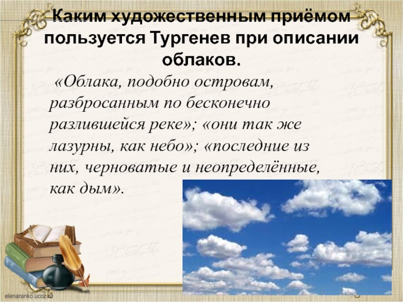 Слайд 11Каким художественным приёмом пользуется Тургенев при описании облаков.