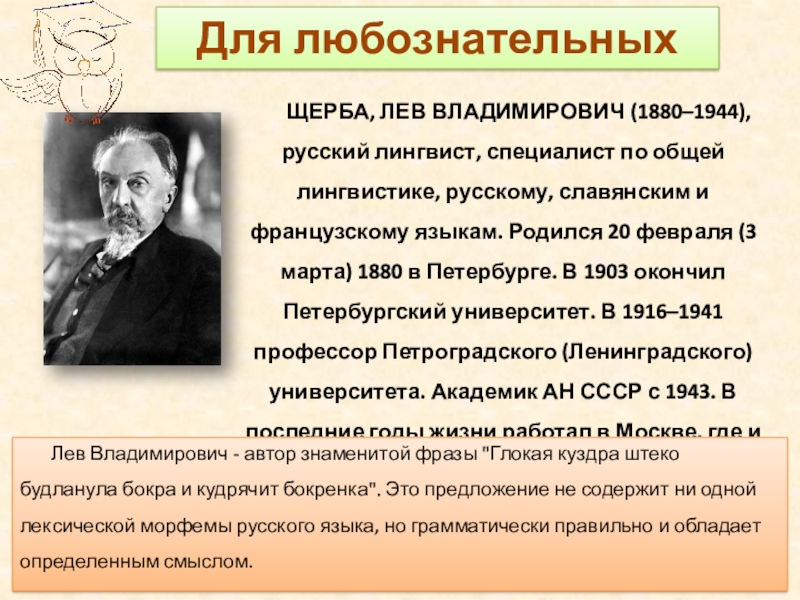 Лев Владимирович - автор знаменитой фразы "Глокая куздра штеко будланула бокра и кудрячит бокренка". Это предложение не содержит ни одной лексической морфемы русского языка, но грамматически правильно и обладает определенным смыслом.