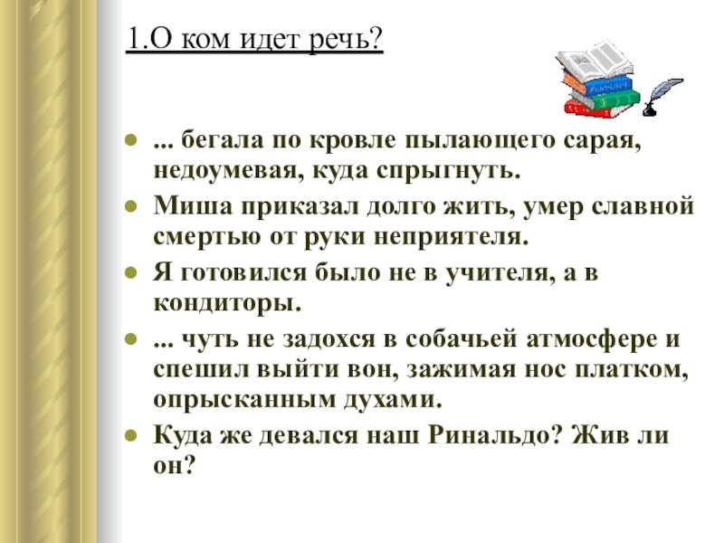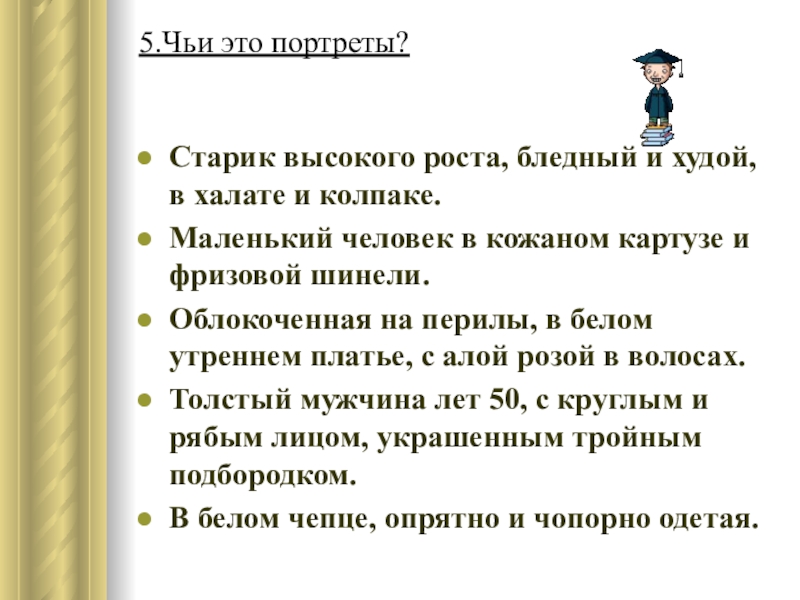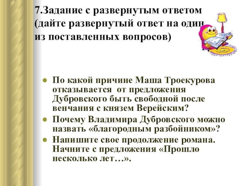 в художественном произведении, к её роли и идейно-образной структуре; проверить знание художественного произведения, степень овладения литературоведческим аппаратом;