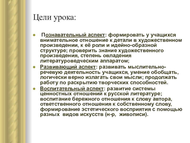 Воспитательный аспект: развитие системы ценностных отношений к русской литературе; воспитание бережного отношения к слову автора, ответственного отношения к собственному слову, формирование эстетического восприятия с помощью разных видов искусств (н-р, живописи).