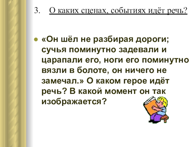 дороги; сучья поминутно задевали и царапали его, ноги его поминутно вязли в болоте, он ничего не замечал.» О каком герое идёт речь? В какой момент он так изображается?