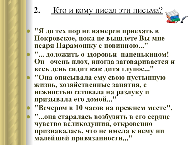 пор не намерен приехать в Покровское, пока не вышлете Вы мне псаря Парамошку с повинною..."