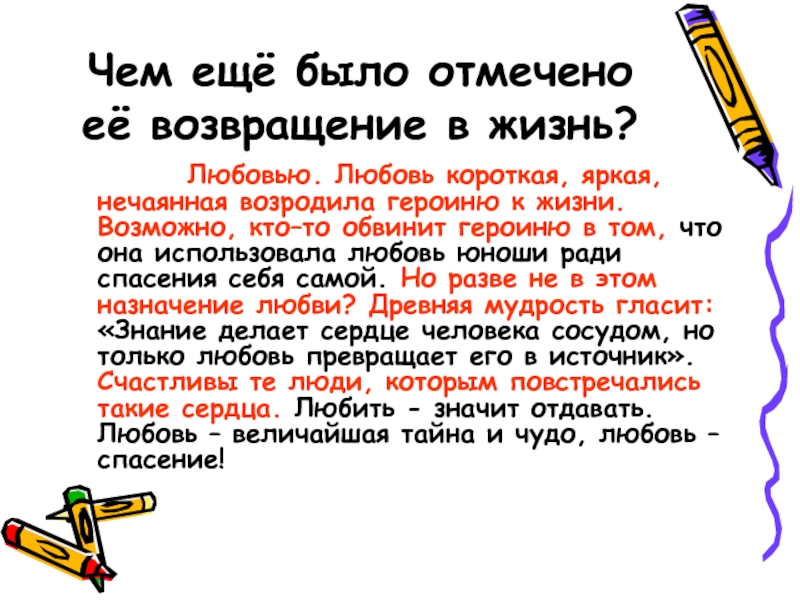 нечаянная возродила героиню к жизни. Возможно, кто–то обвинит героиню в том, что она использовала любовь юноши ради спасения себя самой. Но разве не в этом назначение любви? Древняя мудрость гласит: «Знание делает сердце человека сосудом, но только любовь превращает его в источник». Счастливы те люди, которым повстречались такие сердца. Любить - значит отдавать. Любовь – величайшая тайна и чудо, любовь – спасение!