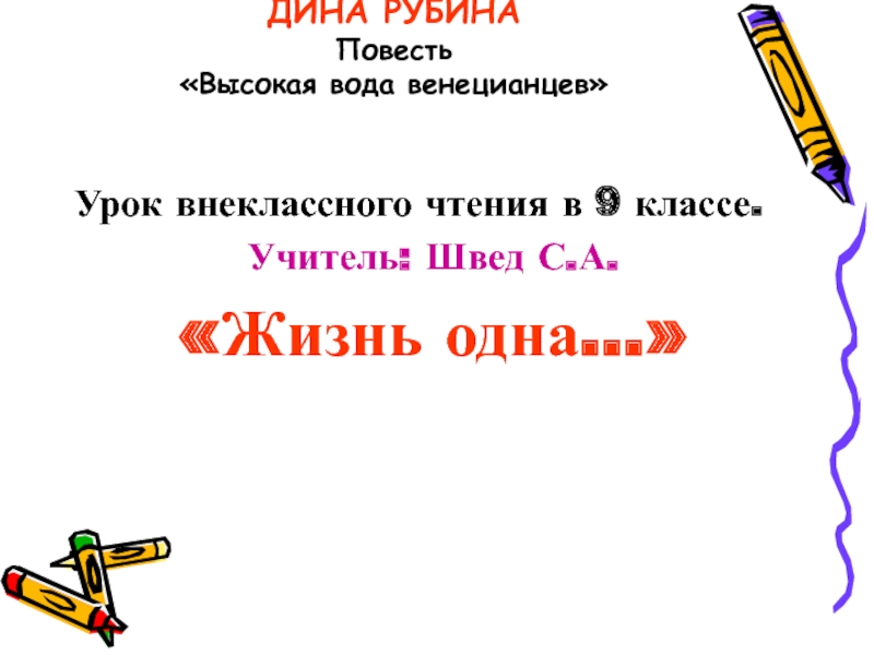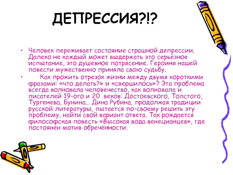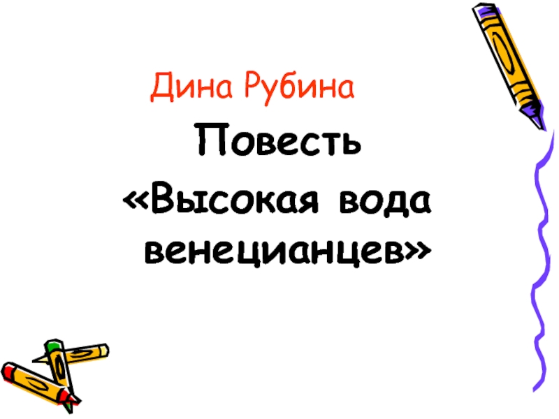 Как прожить отрезок жизни между двумя короткими фразами: «что делать?» и «свершилось»? Эта проблема всегда волновала человечество, как волновала и писателей 19-ого и 20 веков: Достоевского, Толстого, Тургенева, Бунина… Дина Рубина, продолжая традиции русской литературы, пытается по-своему решить эту проблему, найти свой вариант ответа. Так рождается философская повесть «Высокая вода венецианцев», где постоянен мотив обречённости.