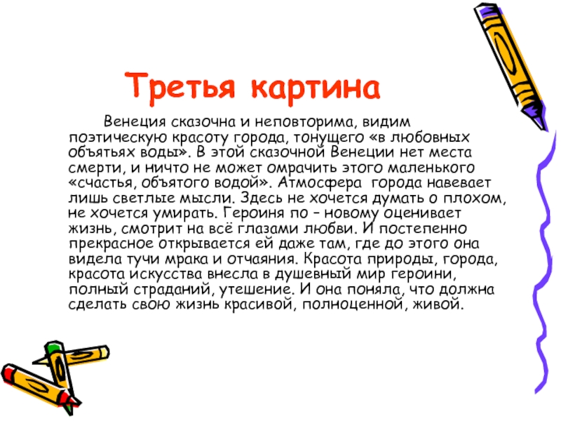 «в любовных объятьях воды». В этой сказочной Венеции нет места смерти, и ничто не может омрачить этого маленького «счастья, объятого водой». Атмосфера города навевает лишь светлые мысли. Здесь не хочется думать о плохом, не хочется умирать. Героиня по – новому оценивает жизнь, смотрит на всё глазами любви. И постепенно прекрасное открывается ей даже там, где до этого она видела тучи мрака и отчаяния. Красота природы, города, красота искусства внесла в душевный мир героини, полный страданий, утешение. И она поняла, что должна сделать свою жизнь красивой, полноценной, живой.