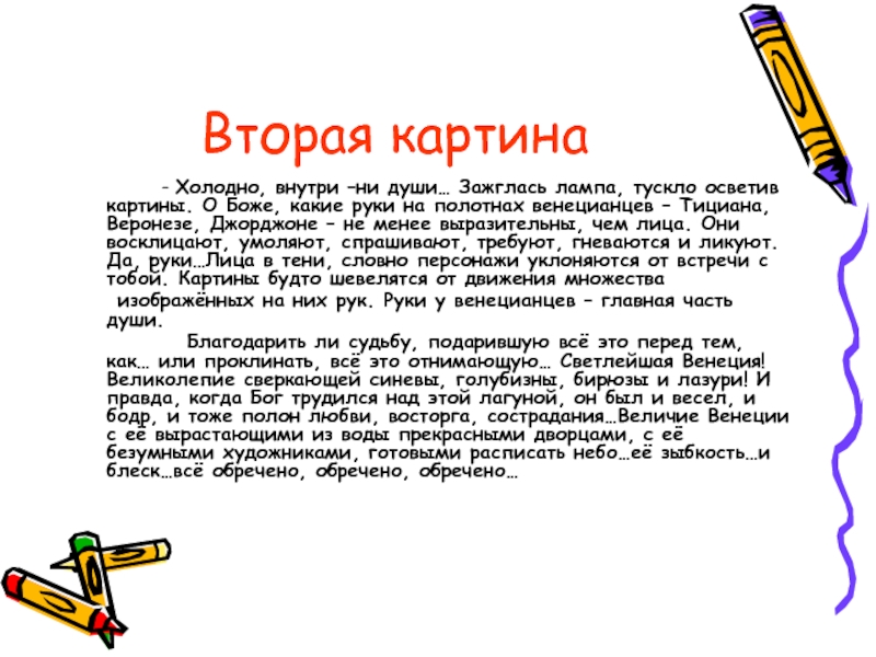О Боже, какие руки на полотнах венецианцев – Тициана, Веронезе, Джорджоне – не менее выразительны, чем лица. Они восклицают, умоляют, спрашивают, требуют, гневаются и ликуют. Да, руки…Лица в тени, словно персонажи уклоняются от встречи с тобой. Картины будто шевелятся от движения множества