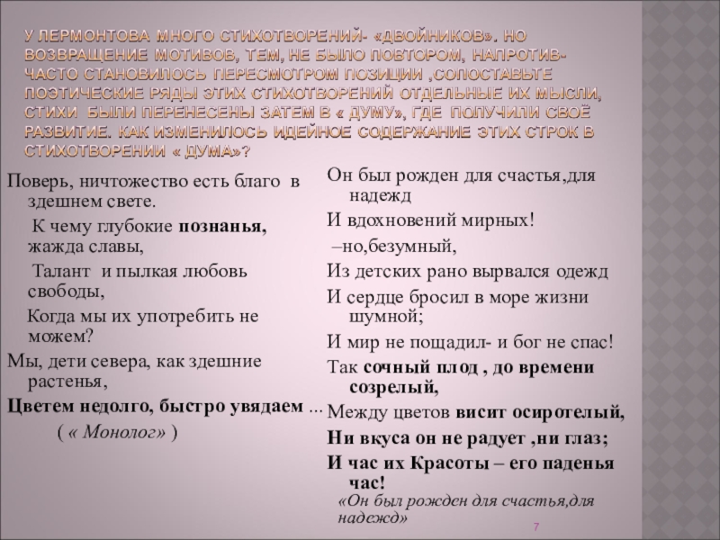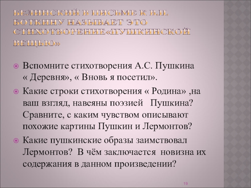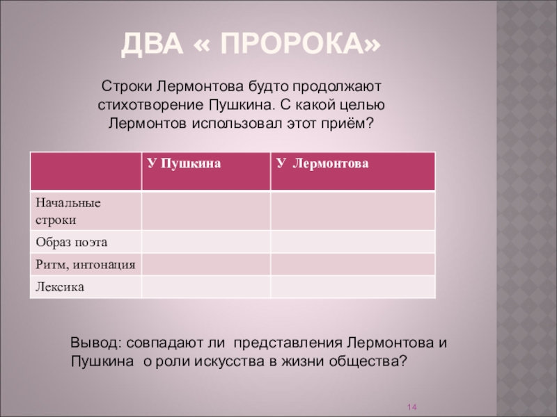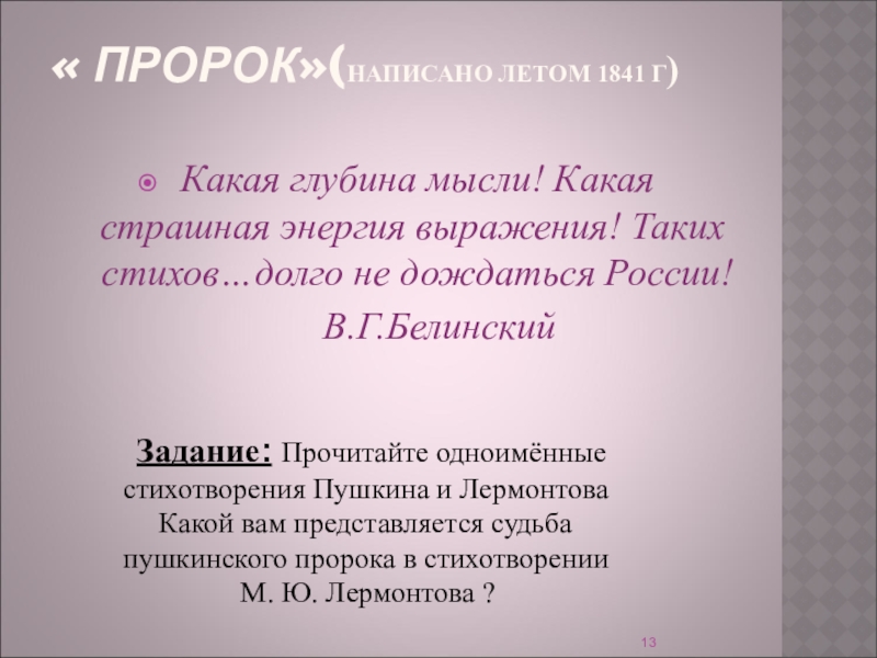 Задание: Прочитайте одноимённые стихотворения Пушкина и Лермонтова Какой вам представляется судьба пушкинского пророка в стихотворении