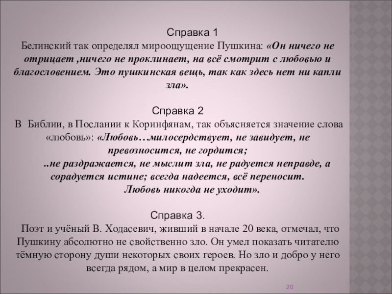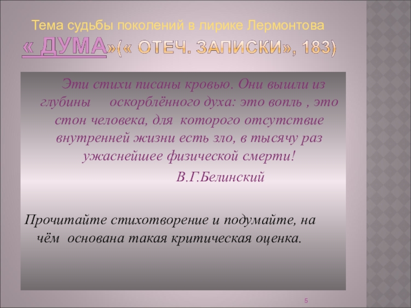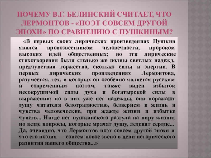 «В первых своих лирических произведениях Пушкин явился провозвестником человечности, пророком высоких идей общественных; но эти лирические стихотворения были столько же полны светлых надежд, предчувствия торжества, сколько силы и энергии. В первых лирических произведениях Лермонтова, разумеется, тех, в которых он особенно является русским и современным поэтом, также виден избыток несокрушимой силы духа и богатырской силы в выражении; но в них уже нет надежды, они поражают душу читателя безотрадностию, безверием в жизнь и чувства человеческие, при жажде жизни и избытке чувств... Нигде нет пушкинского разгула на пиру жизни; но везде вопросы, которые мрачат душу, леденят сердце... Да, очевидно, что Лермонтов поэт совсем другой эпохи и что его поэзия — совсем новое звено в цепи исторического развития нашего общества...»