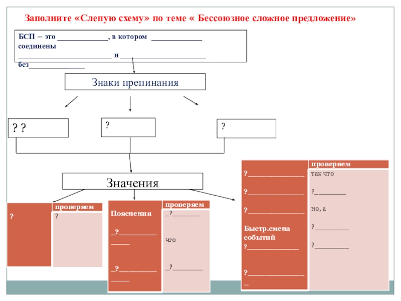 Заполните «Слепую схему» по теме « Бессоюзное сложное предложение»