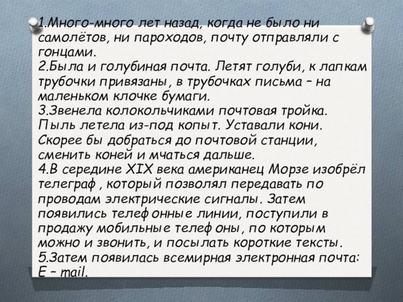 4.В середине XIX века американец Морзе изобрёл телеграф, который позволял передавать по проводам электрические сигналы. Затем появились телефонные линии, поступили в продажу мобильные телефоны, по которым можно и звонить, и посылать короткие тексты.