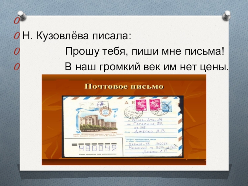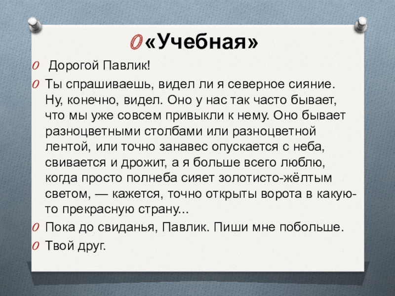 в) В «Энциклопедическом словаре юного литературоведа» выделяется 2 вида писем: личное и деловое. - Давайте рассмотрим разновидности личного письма: