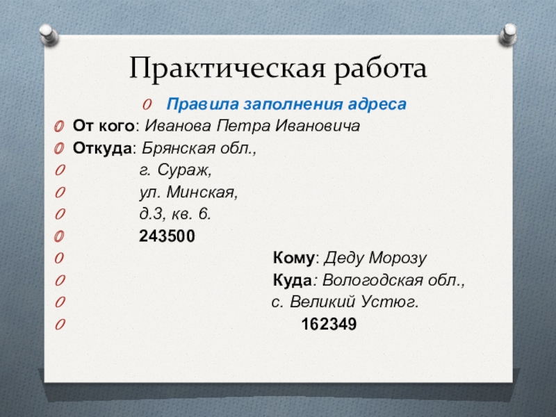 Надпись на письме, почтовом отправлении, указывающая место назначения и получателя.