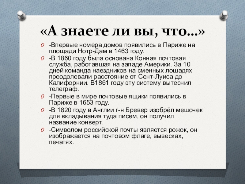 -Первые в мире почтовые ящики появились в Париже в 1653 году.