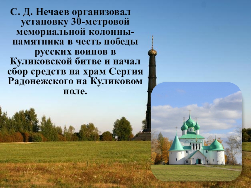 Слайд 5С. Д. Нечаев организовал установку 30-метровой мемориальной колонны-памятника в честь победы русских воинов