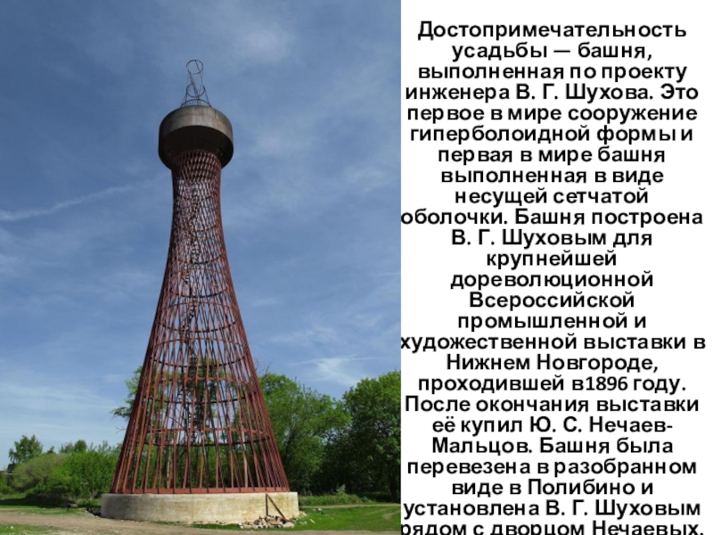 Слайд 8Достопримечательность усадьбы — башня, выполненная по проекту инженера В. Г. Шухова. Это первое в