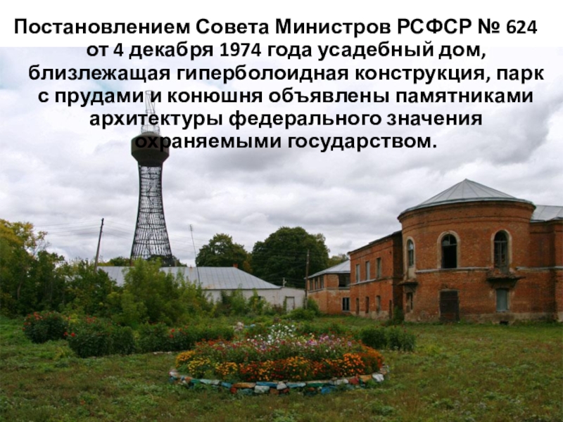 Постановлением Совета Министров РСФСР № 624 от 4 декабря 1974 года усадебный дом, близлежащая гиперболоидная конструкция, парк с