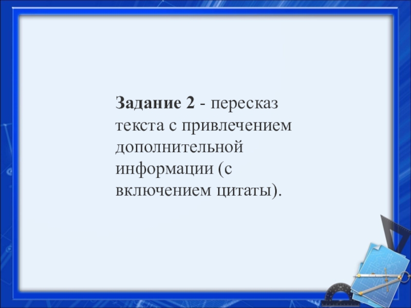 Слайд 4Задание 2 - пересказ текста с привлечением дополнительной информации (с включением цитаты).