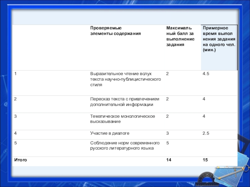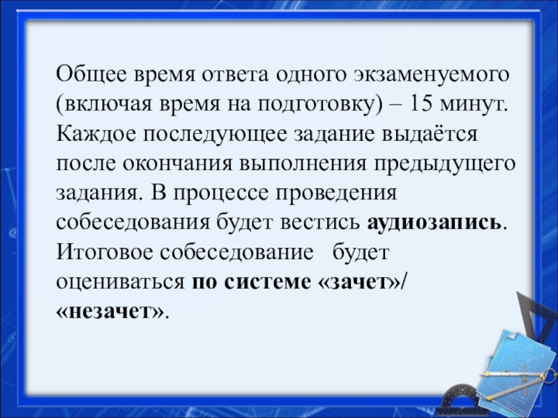 Слайд 9Общее время ответа одного экзаменуемого (включая время на подготовку) – 15 минут.