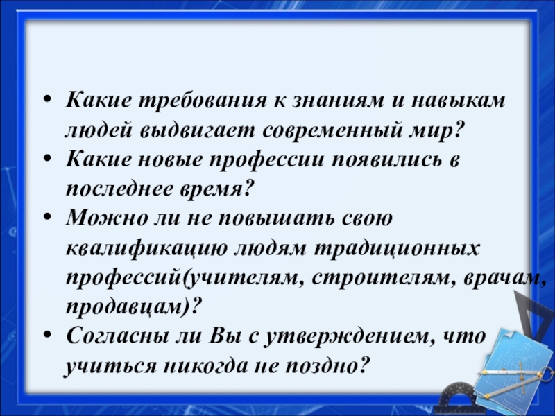 Какие требования к знаниям и навыкам людей выдвигает современный мир?Какие новые профессии появились в последнее время?Можно ли