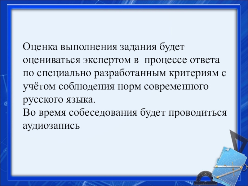 Слайд 12Оценка выполнения задания будет оцениваться экспертом в процессе ответа по специально
