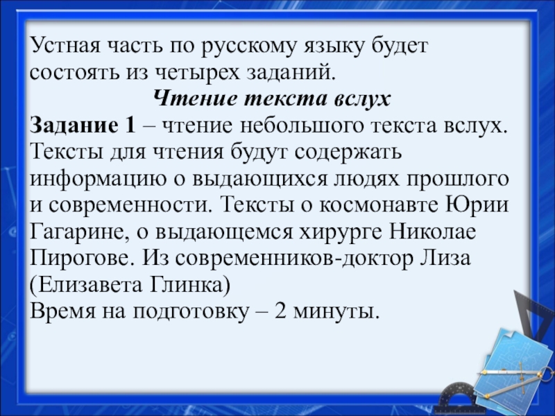 Задание 1 – чтение небольшого текста вслух. Тексты для чтения будут содержать информацию о выдающихся людях прошлого и современности. Тексты о космонавте Юрии Гагарине, о выдающемся хирурге Николае Пирогове. Из современников-доктор Лиза (Елизавета Глинка)