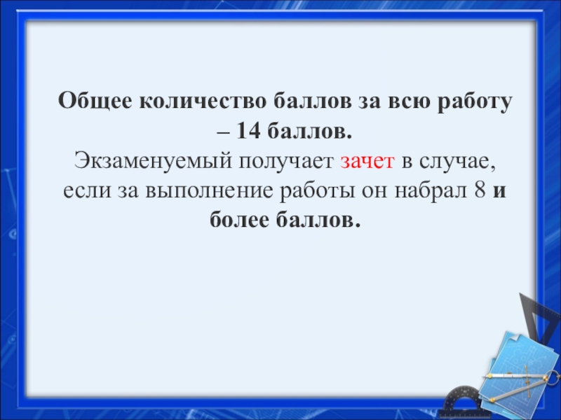 Общее количество баллов за всю работу – 14 баллов.Экзаменуемый получает зачет в случае, если за выполнение работы он набрал