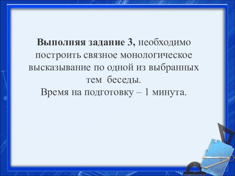 Выполняя задание 3, необходимо построить связное монологическое высказывание по одной из выбранных тем беседы. Время на подготовку –