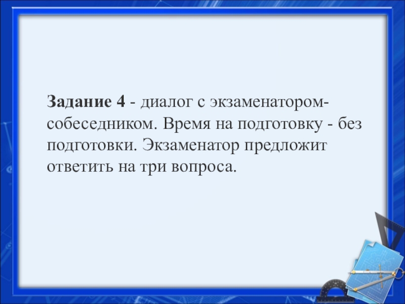 Слайд 7Задание 4 - диалог с экзаменатором-собеседником. Время на подготовку - без подготовки.