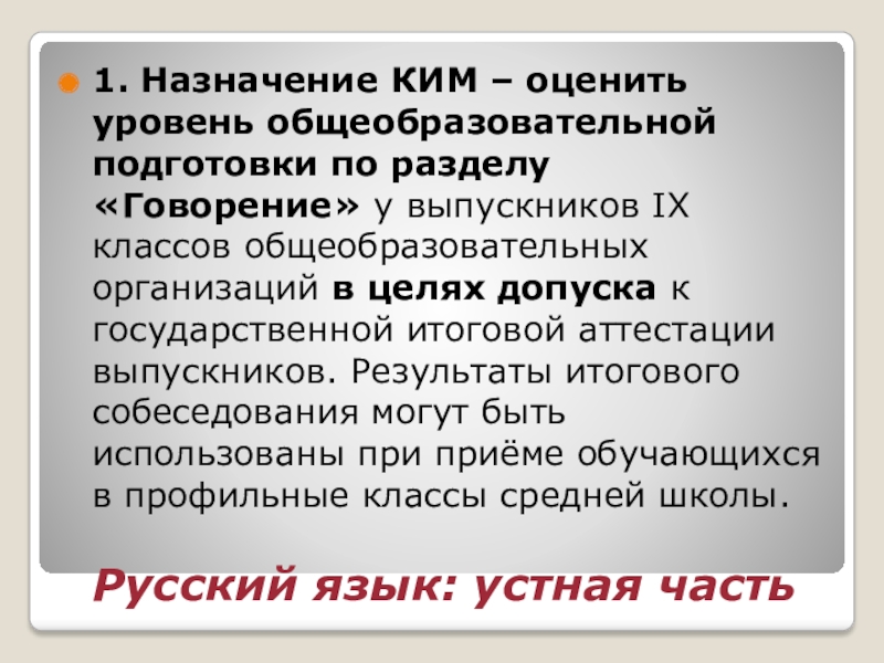 по разделу «Говорение» у выпускников IX классов общеобразовательных организаций в целях допуска к государственной итоговой аттестации выпускников. Результаты итогового собеседования могут быть использованы при приёме обучающихся в профильные классы средней школы.