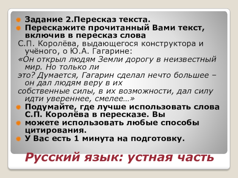Подумайте, где лучше использовать слова С.П. Королёва в пересказе. Вы