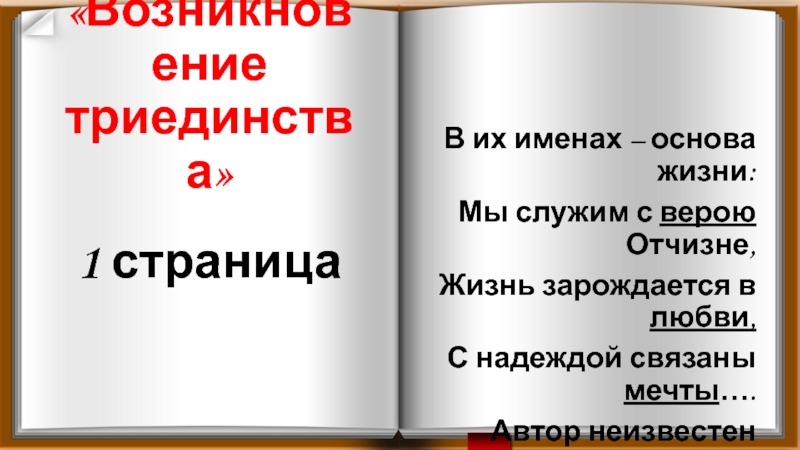 «Возникновение  триединства»1 страница В их именах – основа жизни:Мы служим с верою Отчизне,Жизнь зарождается в любви,С