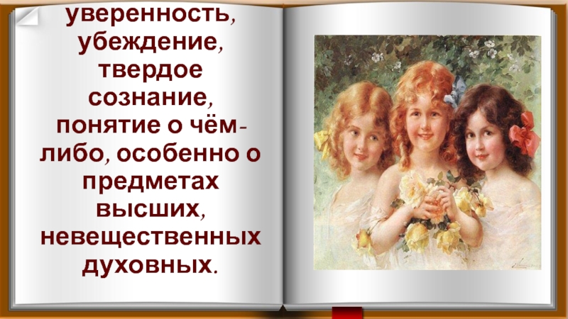 Слайд 5Вера – уверенность, убеждение, твердое сознание, понятие о чём-либо, особенно о