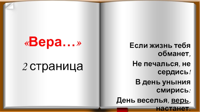 «Вера…»2 страница Если жизнь тебя обманет, Не печалься, не сердись!В день уныния смирись:День веселья, верь, настанет.А.С.Пушкин