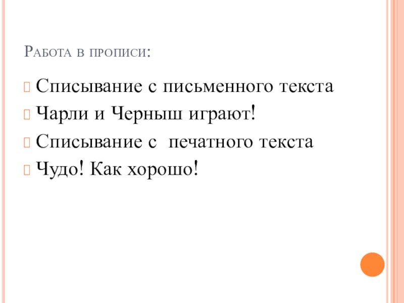 Работа в прописи:Списывание с письменного текстаЧарли и Черныш играют!Списывание с печатного текстаЧудо! Как хорошо!